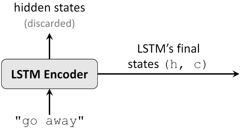 Hình bên dưới là cấu trúc Encoder cấu tạo từ LTSM, đầu vào là từng chữ cái (bao gồm cả dấu cách) trong “go away”, chúng ta cần thông tin của hidden state ở thời điểm cuối cùng, bao gồm \(h_{t}\) và \(c_{t}\).