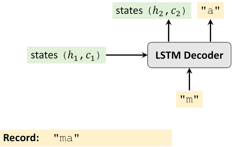 Sau đó lấy \(h_{1}\), \(c_{1}\) và “m” làm đầu vào, nhận đầu ra là “a”, và một hidden state mới \(h_{2}\) và \(c_{2}\)