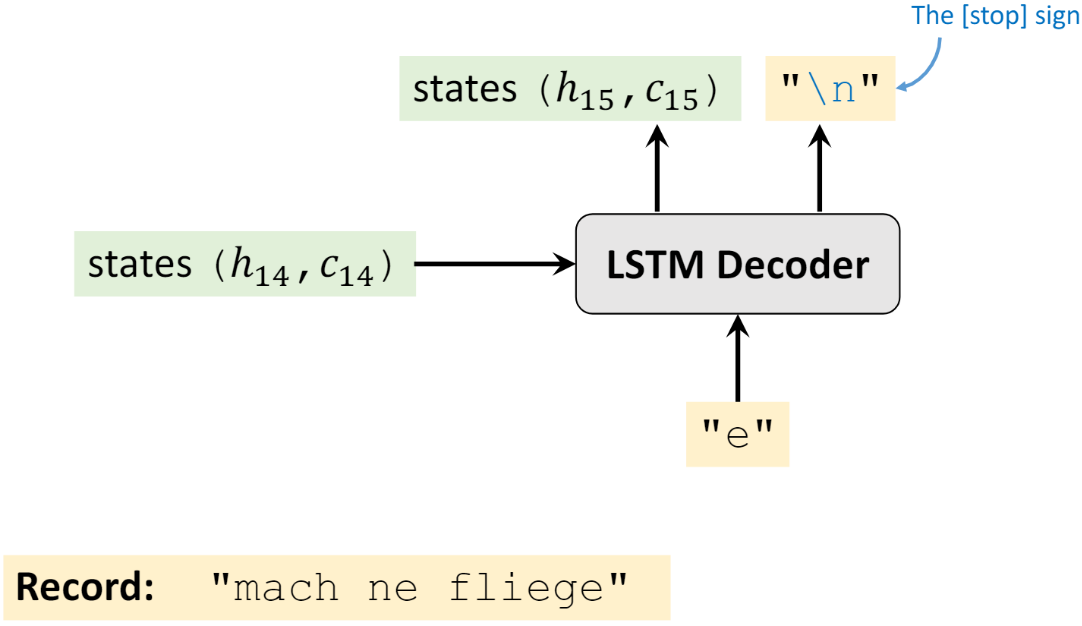 Lặp lại các bước trên cho đến khi ký tự kết thúc của câu cuối cùng được xuất ra (do người dùng xác định, “<EOS>”, “\n”, “E”, … ở đây tôi lấy “\n” làm ví dụ).