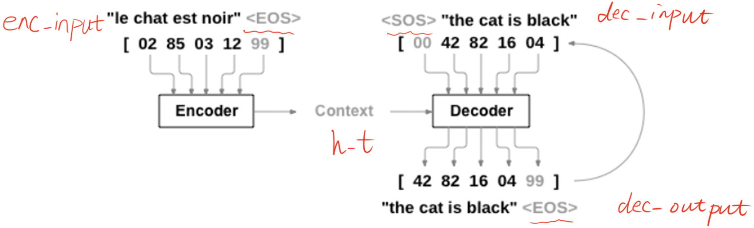 Trước hết, từ hình trên ta có thể thấy rõ ràng, seq2seq cần hoạt động trên ba “biến”, khác với tất cả các cấu trúc mạng mà tôi đã tiếp xúc trước đây. Chúng ta gọi đầu vào cho Encoder là enc_input, đầu vào cho Decoder là dec_input và đầu ra của Decoder là dec_output. Phần sau đây sử dụng một ví dụ cụ thể để minh họa cho toàn bộ quy trình thực hiện của seq2seq.