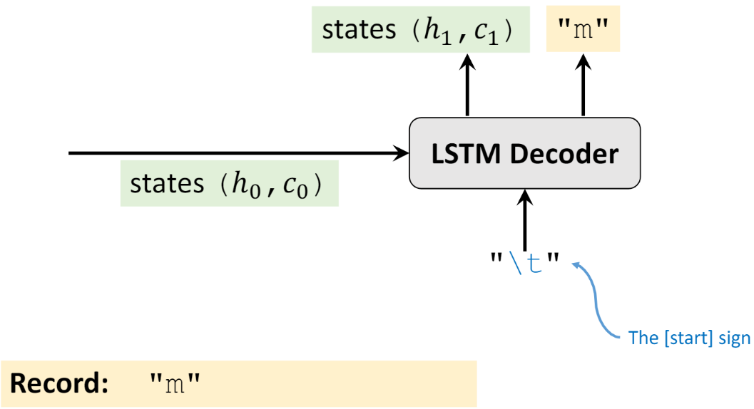 Sau đó sử dụng đầu ra gồm \(h_{t}\) và \(c_{t}\) làm đầu vào cho hidden state đầu tiên của Decoder là \(h_{0}, c_{0}\), như hình bên dưới. Đồng thời, lớp đầu vào (input layer) đầu của Decoder sẽ được nhập một ký tự đại diện cho phần đầu của câu (Do người dùng tự định nghĩa có thể là “<SOS>”, “\t”, “S”, …. đều được chấp nhận. Ở đây, tôi lấy “\t” làm ví dụ), và sau đó nhận đầu ra “m”, và một hidden state mới \(h_{1}\) và \(c_{1}\)